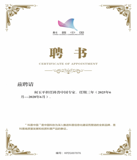 近日,“科普中国”平台聘任公司bevictor伟德、水文化研究中心教师何玉平担任科普中国专家,聘期三年(2025年6月—2028年6月),“科普中国”是中国科协为深入推进科普信息化建设而塑造的全新品牌,是科普高质量发展和优质科普产品的象征。